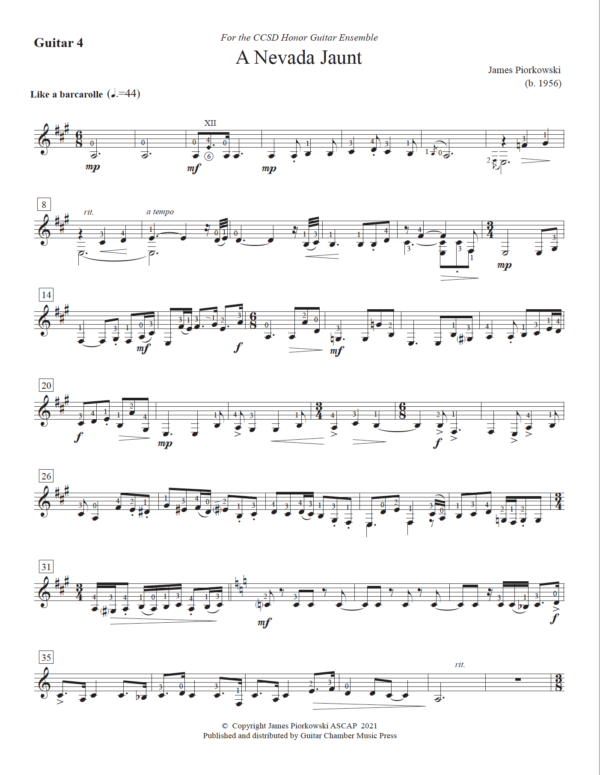 A Nevada Jaunt was commissioned for the Clark County School District High School Honor Guitar Ensemble. Its premiere performance was at the Las Vegas Academy Performing Arts Center on October 23, 2021, with the composer serving as the guest music director.