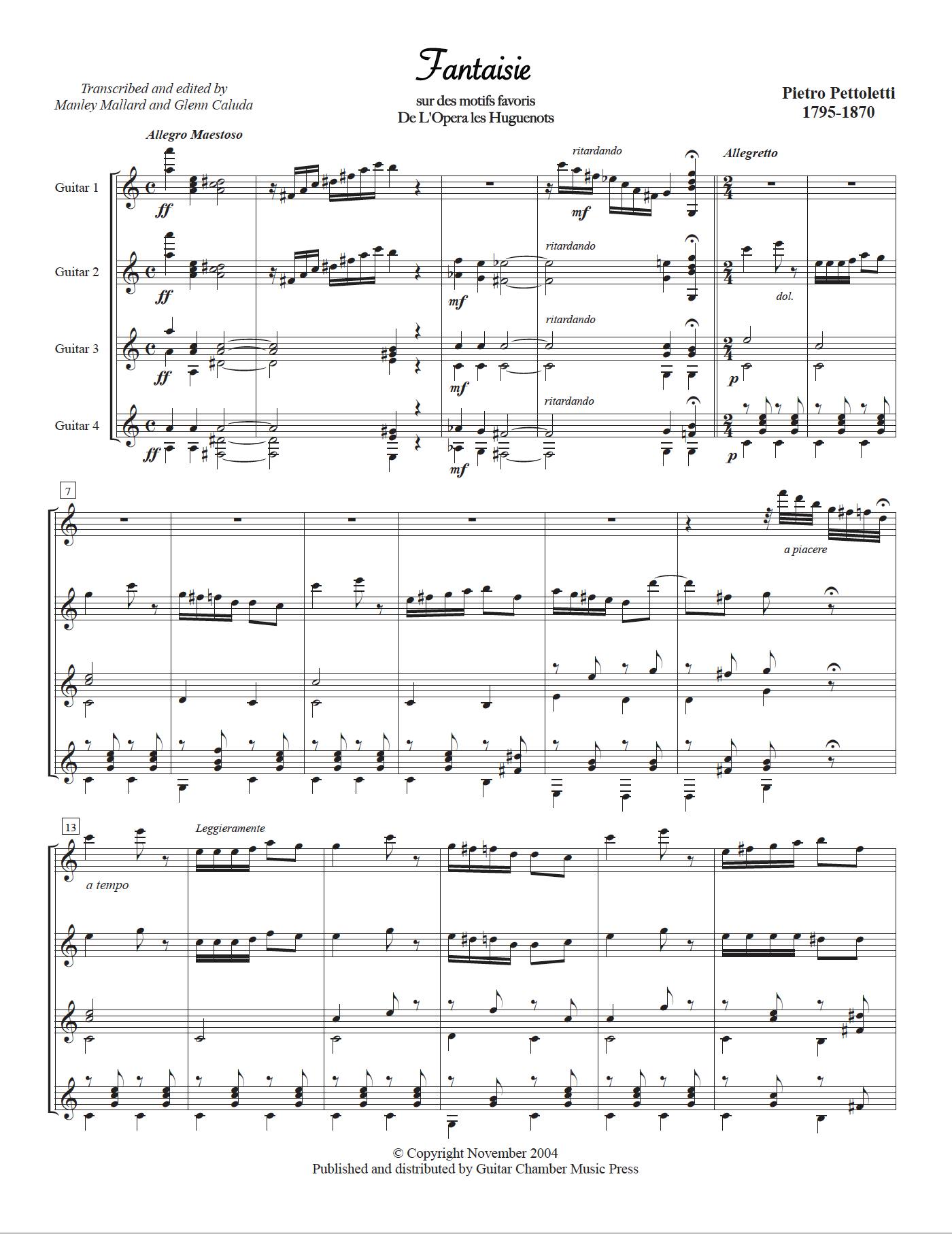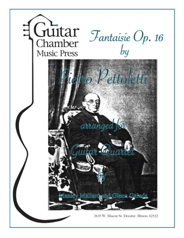 “Fantaisie” Op. 16 sur des motifs favors De L’Opera les “Huguenots” for Guitar Quartet by Pietro Pettoletti and transcribed and edited by Manley Mallard and Glenn Caluda.