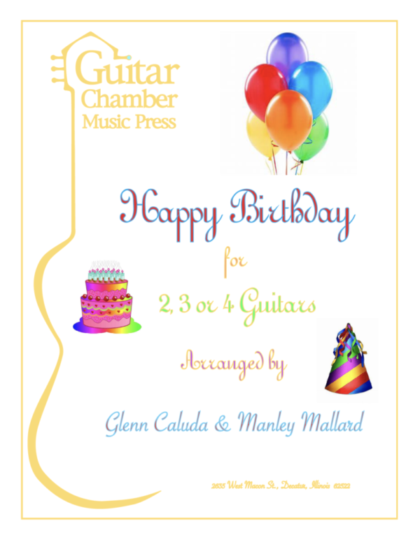 This arrangement of “Happy Birthday” for 2, 3 or 4 guitars is presented here with the statement of the tune and three variations. Each variation gets progressively more interesting with the third variation modulating from E to A and the fourth written in a jazz/swing style, returning to the key of E. The style of scoring used in this edition – putting the first and third guitars on the first staff and the second and fourth on the second staff – makes the music extremely versatile as it can be played as a quartet but also works very well as a trio or duo, for more advanced guitarists.