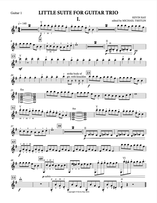 Little Suite for Guitar Trio is a delightful beginner-level piece designed for young musicians. Its jaunty melodies, lightly influenced by the charm of classic video game music, make it both engaging and fun to play. The piece balances simplicity with energetic rhythms, and each player has an equally important role to play.