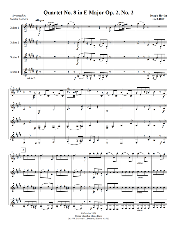 Quartet No. 8 in E major, Op. 2, No. 2 by Joseph Haydn “Father of the String Quartet.” This is the first among Haydn’s early quartets to venture into a key signature beyond the limit of three flats or sharps. The initial Allegro is a jovial jaunt in E major. The first violin starts, whereupon the other instruments sound the second half of the phrase, and a delightful conversation continues between the leading instrument and its three partners. The subsequent movements are all in E major with the exception of a trio in e minor and a beautiful Adagio in A major (eight note = 62-72). This Quartet is of medium to advanced difficulty and is well suited for college or advanced high school guitar ensembles.