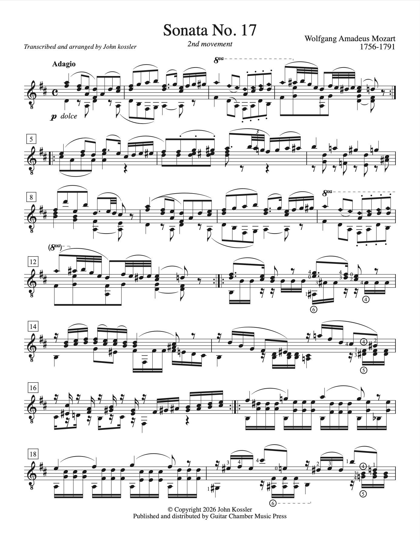 Wolfgang Amadeus Mozart’s Piano Sonata No. 17 in Bâ™ major, K. 570, dated February 1789, is a sonata in three movements. The work is part of a commission by the court of Frederick William II of Prussia for six piano sonatas for Princess Frederica. This arrangement of the second movement has been transposed to the key of D Major.