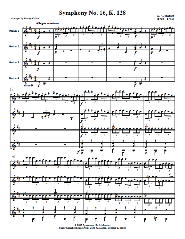 Symphony No. 16 by Wolfgang Amadeus Mozart, arranged by Manley Mallard. Symphony No. 16 in C major (K. 128) was the first of three symphonies composed by Wolfgang Amadeus Mozart in May of 1772, when Mozart was only sixteen years old. The work is one of many written by Mozart while he stayed in Salzburg between two trips he made to Italy. Intermediate difficulty.