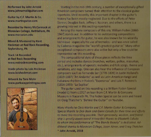 The Guitar Works of William Foden and his American Contemporaries. John Arnold, Classical Guitar (William Foden Special, model E from c. 1917, on loan from the C.F. Martin & Company Museum in Nazareth, PA.) Includes music by William Foden, Charles J. Dorn, Justin Holland, Albert J. Weidt, Edward R. Day, Vahdah Olcott-Bickford, Luis T. Romero and Charles De Janon.