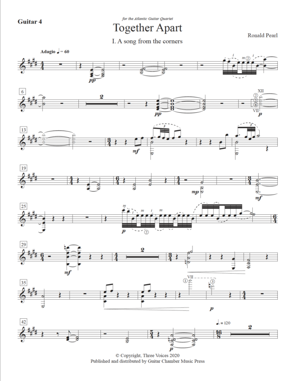 The title is a reference to the conditions at the time I was commissioned to compose this work, the first months of covid-19. As it was being discussed, one of the possibilities for the performance was with the performers several feet apart. So, the title reflects that possible reality – playing together, but also separated. Additionally, it refers to the fact that ensembles work essentially that way: practice alone, and only on the occasions of a rehearsal and performance come together in a single, shared space. And, of course, being together – yet apart – was how life was unfolding at that time.