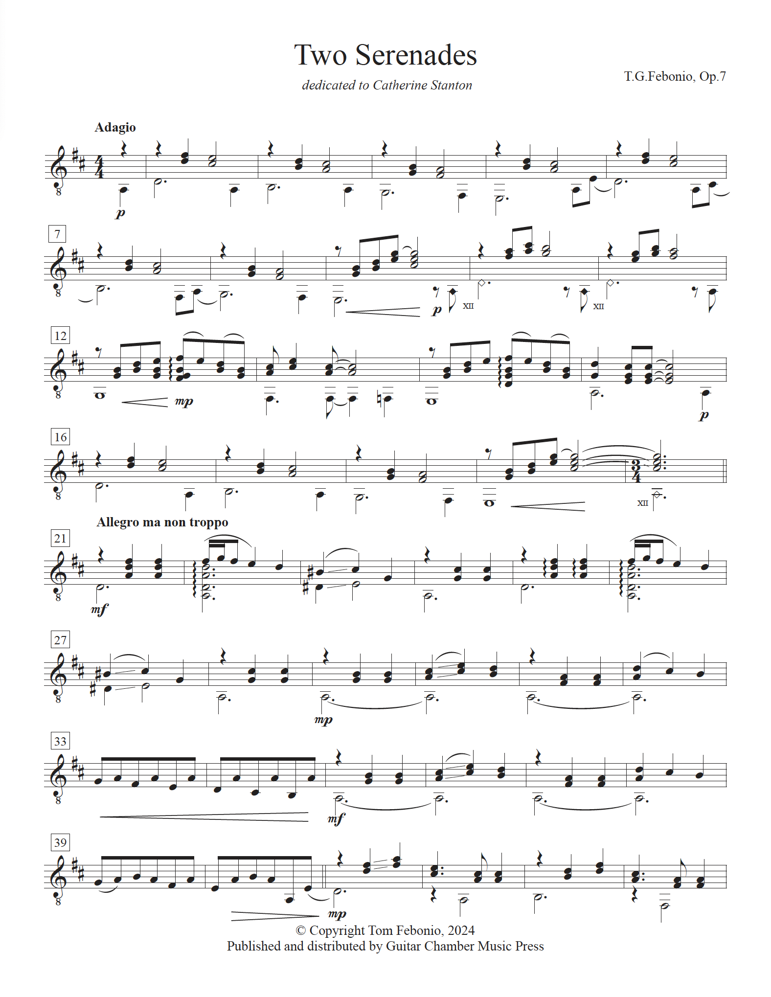 Two Serenades for guitar, an expressive and genial work, was written in October of 1984. The first serenade opens with a brief Adagio, followed by a spirited rondo marked Allegro ma non troppo. The second serenade, Allegro non troppo, is song-like in form and character. Performance time is approximately 7 minutes.